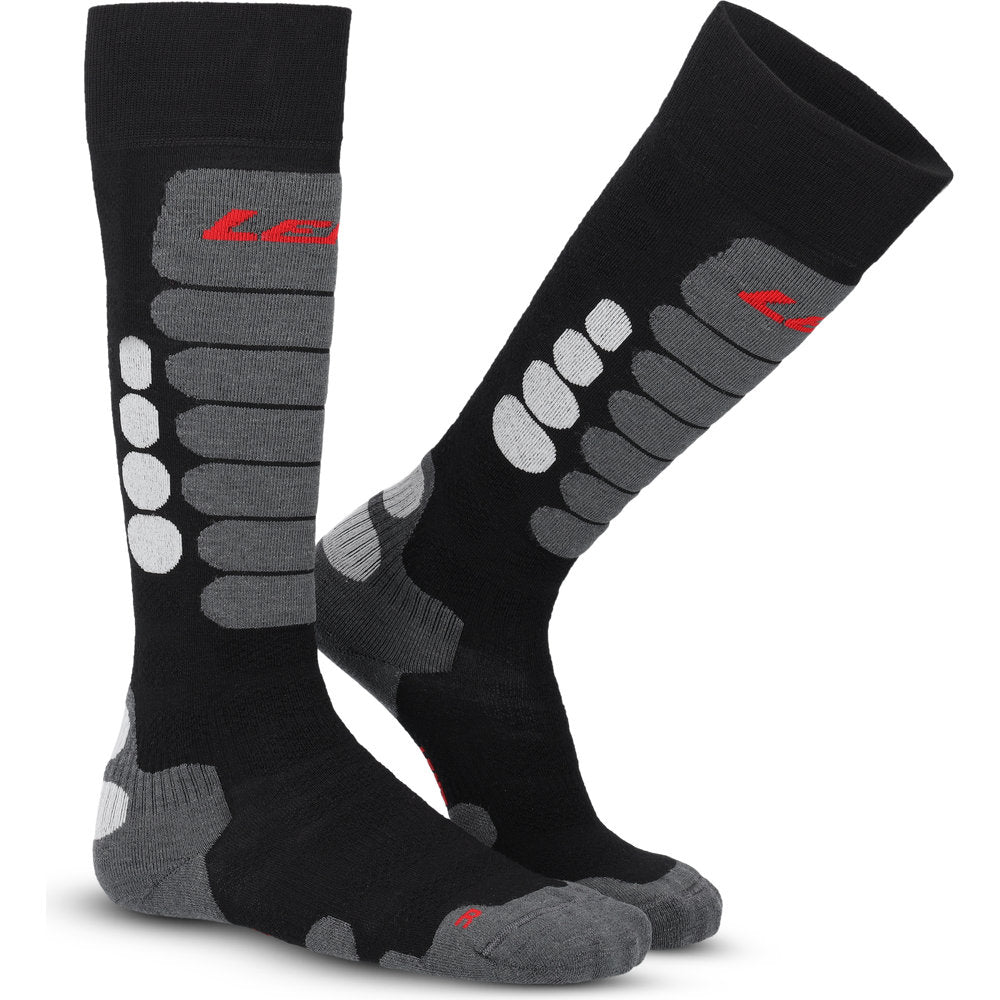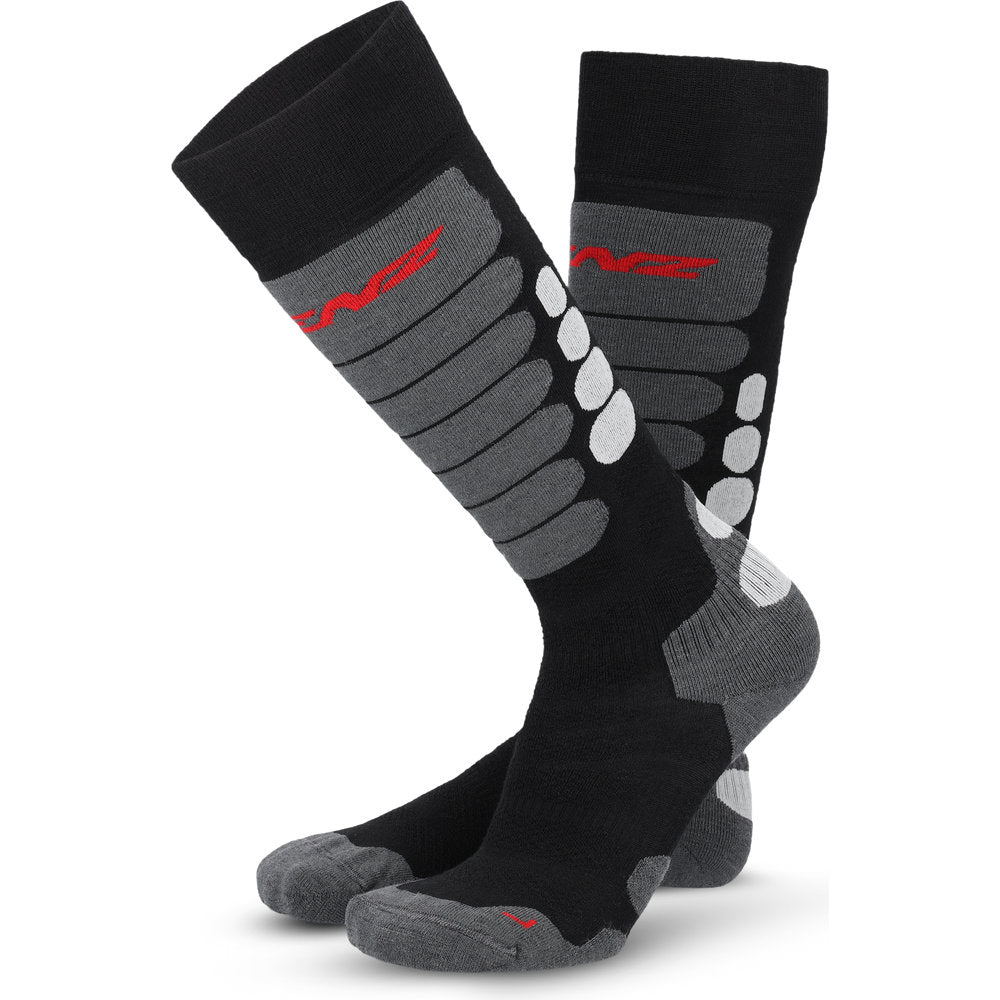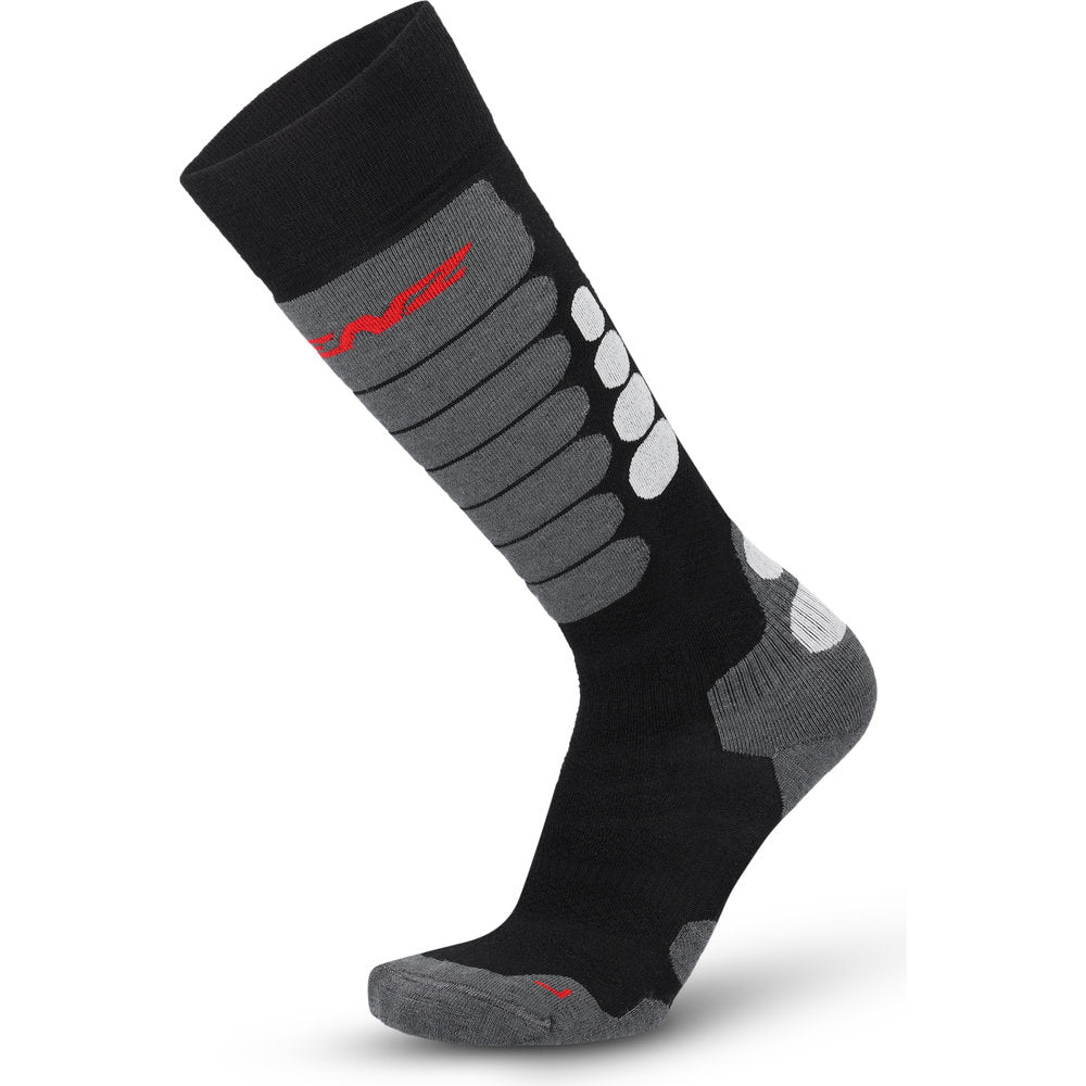 Sokken er anatomisk strikket til venstre og højre fod og har forstærkede zoner ved tå og hæl, samt ekstra polstring ved skinnebenet, hvor skistøvlen trykker mest. Ringbånd ved vrist og ankel sikrer optimal pasform og forhindrer, at sokken glider i løbet af dagen.